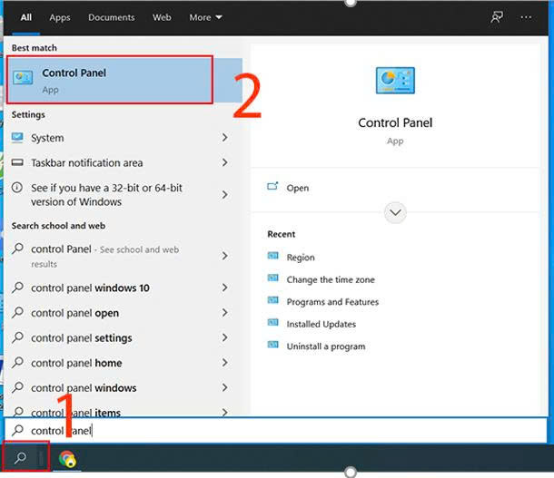 Nhấn vàokính lúpđể tìm kiếmControl Panel> Chọnứng dụng Control Panel.