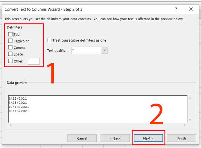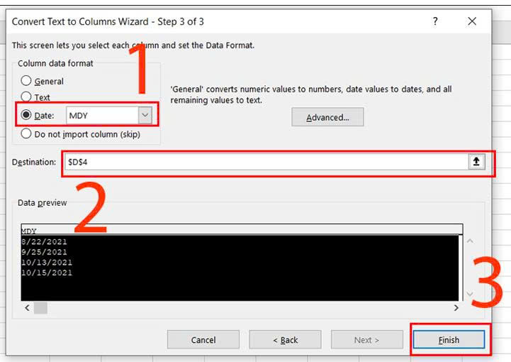 TạiDatebạn chọnMDY> Chọn nơi muốnđưa dữ liệu ra> NhấnFinish.