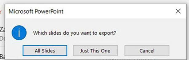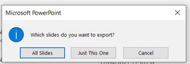 Sau khi bạn bấm chọn Save thì một hộp thoại cảnh báo sẽ xuất hiện với nội dung hỏi bạn muốn chuyển đổi tất cả các slide sang ảnh hoặc chỉ một slide. Lúc này nếu muốn chuyển đổi tất slide sang ảnh thì bạn nútAll Slidescòn nếu chỉ muốn chuyển đổi slide đầu tiên sang ảnh thì bạn chọnJust This One.